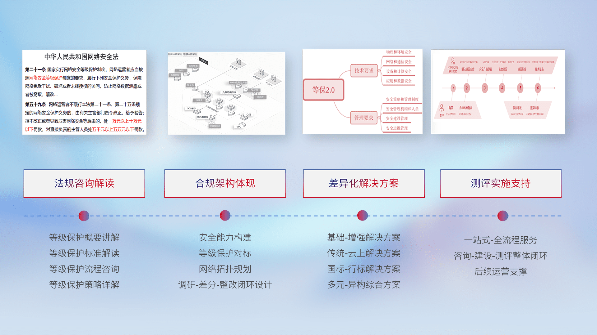 通过专业的法律咨询解读、、、、合规架构体现、、、、差异化解决方案、、、测试实施支持等服务,,为客户量身打造等保合规体系。。。。
